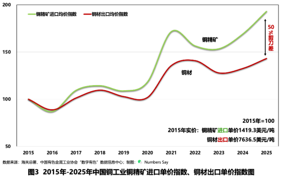 相关数据也反映出这种不对称格局:铜精矿进口单价10年来上涨了93%,铜材出口单价却只涨了43%。资源端价格上升快于加工端价值提升,说明我国在资源采购环节承受了更大的成本压力,而加工制造端对价值的传导和吸收能力仍有不足。