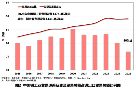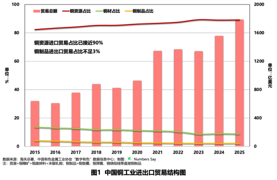 过去10年,一个趋势十分清晰:我国铜工业贸易逆差长期维持在较高水平,且铜资源贸易额占行业贸易总额的比重持续提升,已由约80%上升至约90%。这表明,我国铜工业对外贸易中的资源属性进一步强化,资源端短板并未因制造能力提升而得到根本缓解。