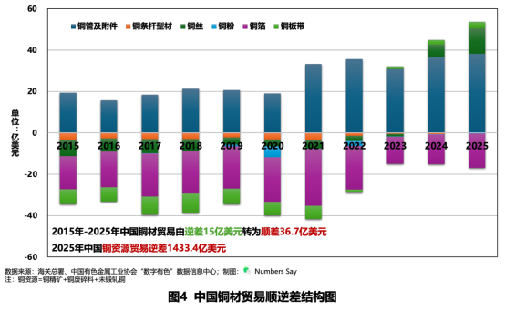 但也要看到,加工端的改善,目前还难以从根本上对冲资源端的大额逆差。2025年,中国铜资源贸易逆差1433.4亿美元,铜材贸易顺差仅36.7亿美元。与资源进口规模相比,铜材贸易顺差仍然相对有限。加工制造能力的提升,为行业“止血”发挥了积极作用,但尚不足以彻底改变资源端长期失衡的总体局面。