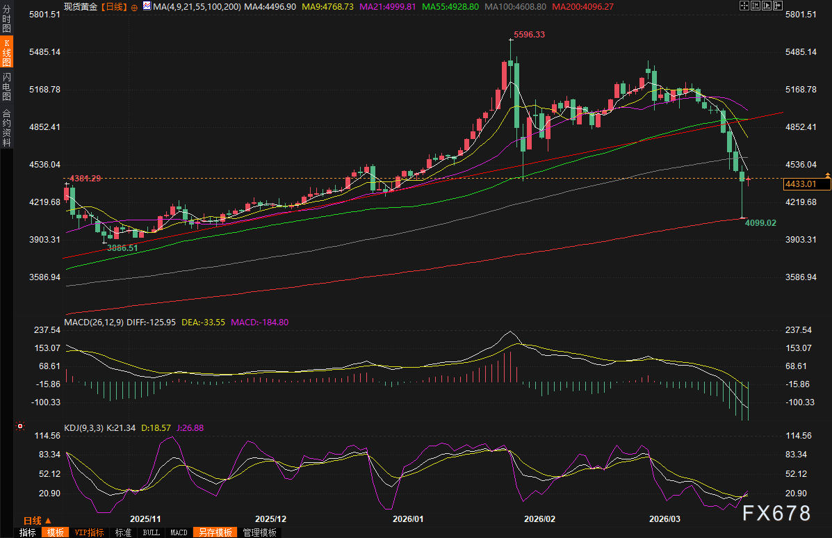于是,一场针对美联储利率预期的“重新定价”开始了。美元指数作为避险货币和对利率最为敏感的货币,率先做出反应,大幅上涨。然而,对于黄金而言,这却是一场完美的风暴。黄金虽然被视为传统的通胀对冲工具,但在当前的市场环境下,它更直接地受到利率预期的打击。由于黄金本身不产生利息,持有它的机会成本与无风险利率(通常参考美债收益率)息息相关。当市场开始押注美联储不会降息甚至可能加息时,持有黄金的机会成本飙升,投资者纷纷抛售黄金,转而拥抱美元或美债。现货黄金在这场抛售潮中一泻千里,盘中跌幅一度超过8.7%,触及4099.02美元/盎司的惊人低位,这不仅是四个月来的新低,更令其一度逼近200日均线这一关键的技术支撑位。上周金价已经创下自1983年以来最差的周度表现,而周一的这波急跌,无疑是将其推向了更深的深渊。High Ridge Futures的金属交易总监David Meger精准地描述了当时的情景:“隔夜的抛售是过去几个交易日多头平仓的延续,主要受加息预期推动。” 市场仿佛已经认定了,黄金的熊市才刚刚开始。