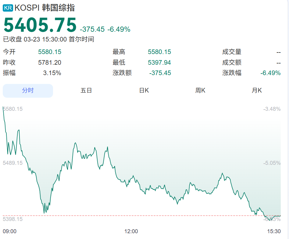 亚洲市场连续三日下探,韩国股市单日暴跌近6.34%、触发熔断,成为全球股市重灾区;日本日经225指数同步大跌4.88%、触发熔断。