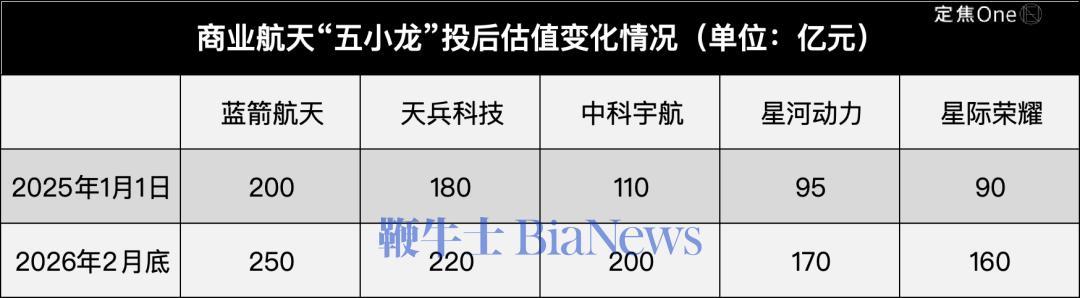 “定焦One”结合多位参与商业航天一级市场融资的投资人所提供的信息,五家公司在今年2月底的投后总估值已经至少达到1000亿元,一年多时间增长325亿元,平均每家的估值增加65亿元。