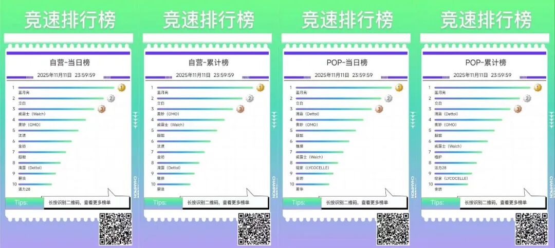 这种深度种草的能力,直接转化成了复购率。数据显示,京东平台的表现尤为突出——2025年双十一期间,蓝月亮在京东包揽衣物清洁品牌自营当日榜、自营累计榜、POP当日榜、POP累计榜四项第一。