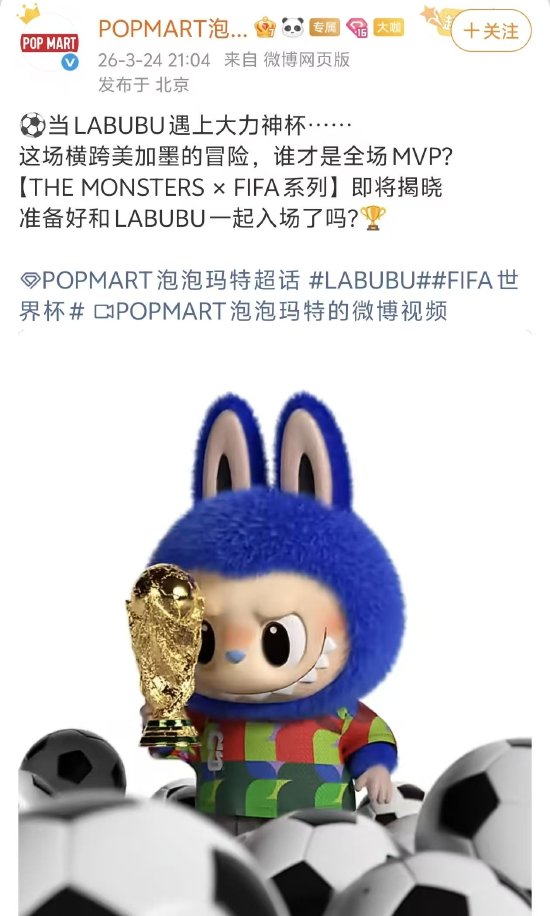新浪科技讯 3月25日上午消息,昨日,泡泡玛特官方账号发文称,“THE MONSTERS × FIFA系列”即将揭晓。