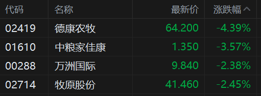 港股猪肉概念股集体走低,其中,德康农牧跌超4%,中粮家佳康跌3.6%并且录得4连跌,牧原股份、万洲国际跌超2%。