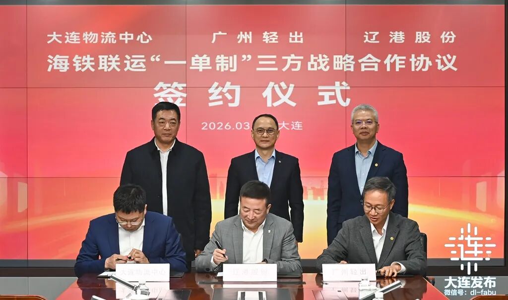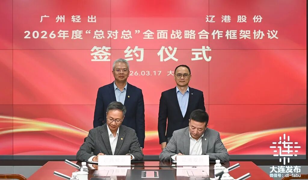 签约仪式上,辽港股份与广州轻出签署了《2026年度“总对总”全面战略合作框架协议》,辽港股份与广州轻出、大连铁路物流中心签署了《海铁联运“一单制”三方战略合作协议》。