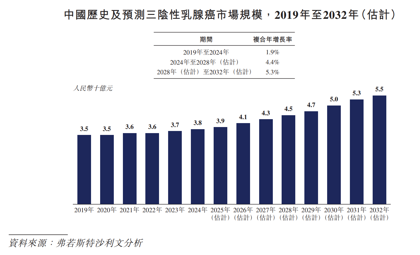 三阴性乳腺癌(“三阴性乳腺癌”)是指雌激素受体(“ER”)、孕激素受体(“PR”)及人类表皮生长因子受体2(“HER2”)均为阴性的一种乳癌。三阴性乳腺癌约占全球所有乳癌病例的15%至20%,由于缺乏特定的治疗靶点,通常被认为是恶性程度最高的一种亚型。三阴性乳腺癌通常更多在较年轻及绝经前的妇女中被诊断出来。三阴性乳腺癌的全球发病率从2019年的320,100例增加至2024年的364,900例,预计将进一步增加至2028年的382,400例及2032年的405,900例,复合年增长率分别为1.2%及1.5%。在中国,三阴性乳腺癌的患病人数从2019年的49,500例增加至2024年的55,900例,预计将进一步增加至2028年的58,600例及2032年的60,400例,2024年至2028年及2028年至 2032年的复合年增长率分别为1.2%及0.7%。