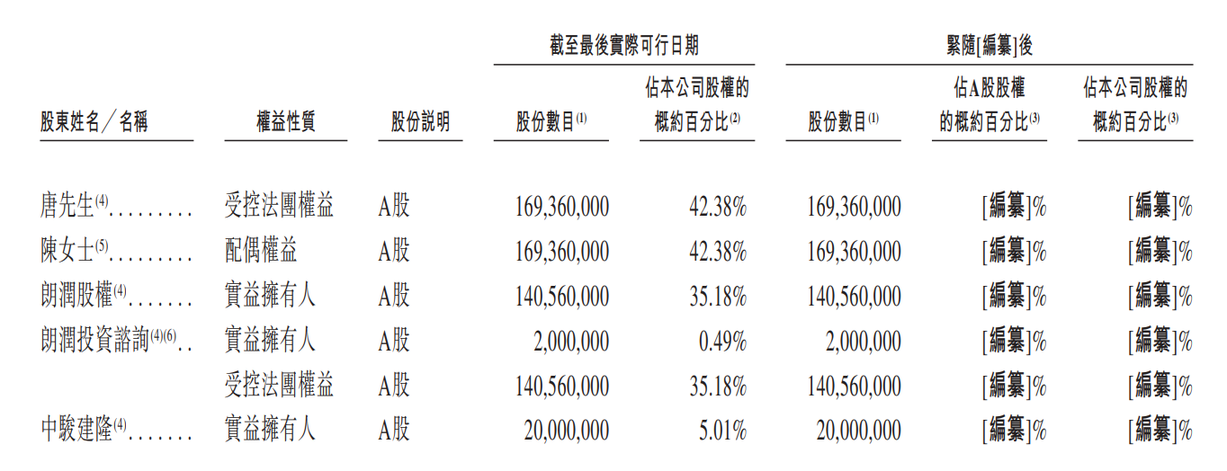 因此,唐先生及陈女士透过控股股东朗润股权、中骏建隆、真珠投资及朗润投资咨询合共控制公司已发行股本总额约42.38%,并于紧接[编纂]前就上市规则而言构成一组控股股东。