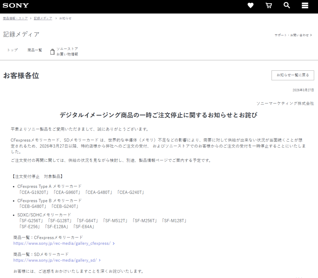 2026年3月27日,受全球存储芯片持续供不应求、价格飙升的影响,日本科技大厂索尼公司通过官网宣布,自2026年3月27日起暂停接受来自授权经销商和索尼商店客户的CFexpress存储卡和SD存储卡订单。