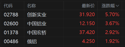 4月2日,港股铝业股逆势拉升,其中,创新实业涨近6%,中国铝业涨近4%,中国宏桥涨3%,俄铝涨近2%。
