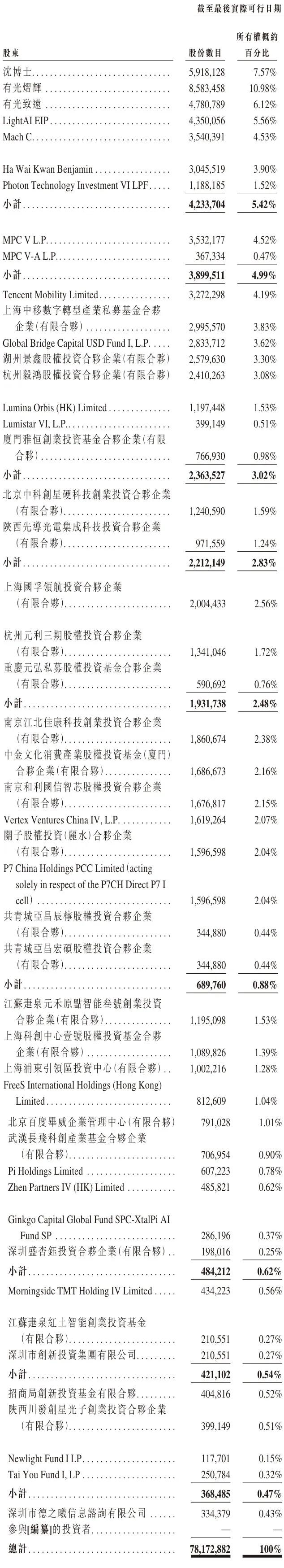 IPO前,沈亦晨博士直接持股为7.57%,有光熠辉持股为10.98%,有光致远持股为6.12%,LightAI EIP持股为5.56%,Mach C持股为4.53%。