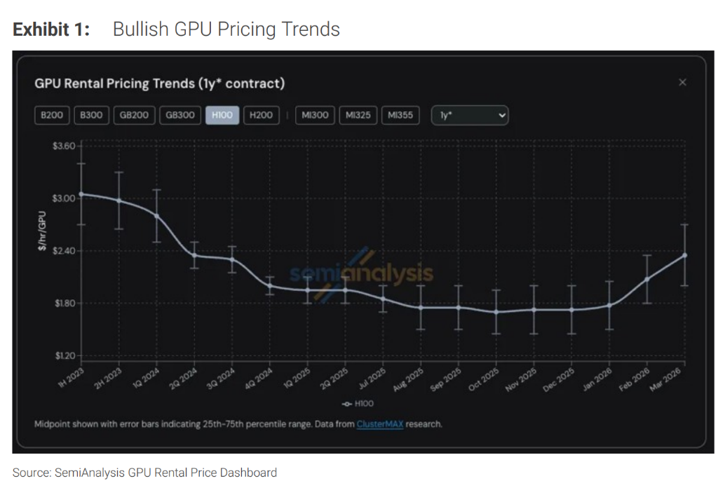 摩根士丹利指出,内存价格上涨推升资本支出通胀、部署挑战以及OpenClaw等自主智能体对算力消耗的持续提升,均可能在短期内维持GPU定价的强势走势。若GPU价格持续攀升,Nebius或将持续跑赢。