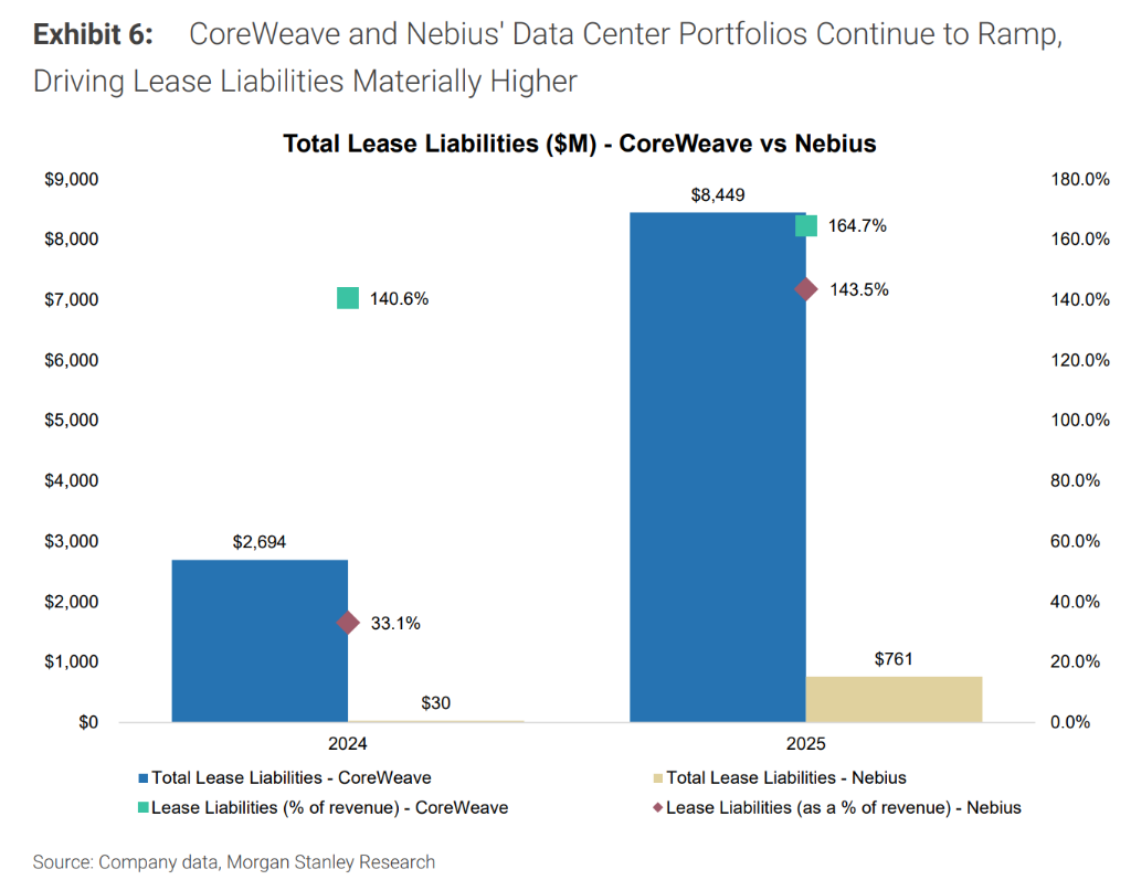 财务数据的鸿沟一目了然。2025年,CoreWeave实现营收51.3亿美元(同比增长168%),EBITDA高达31亿美元,利润率60%;Nebius营收仅5.3亿美元(同比增长479%),EBITDA亏损6,500万美元(利润率-12%)。但增速本身同样令人印象深刻——摩根士丹利预计2026年CoreWeave营收将增至约125亿美元,Nebius则有望跃升至约33亿美元,两家公司均处于超高速扩张轨道。