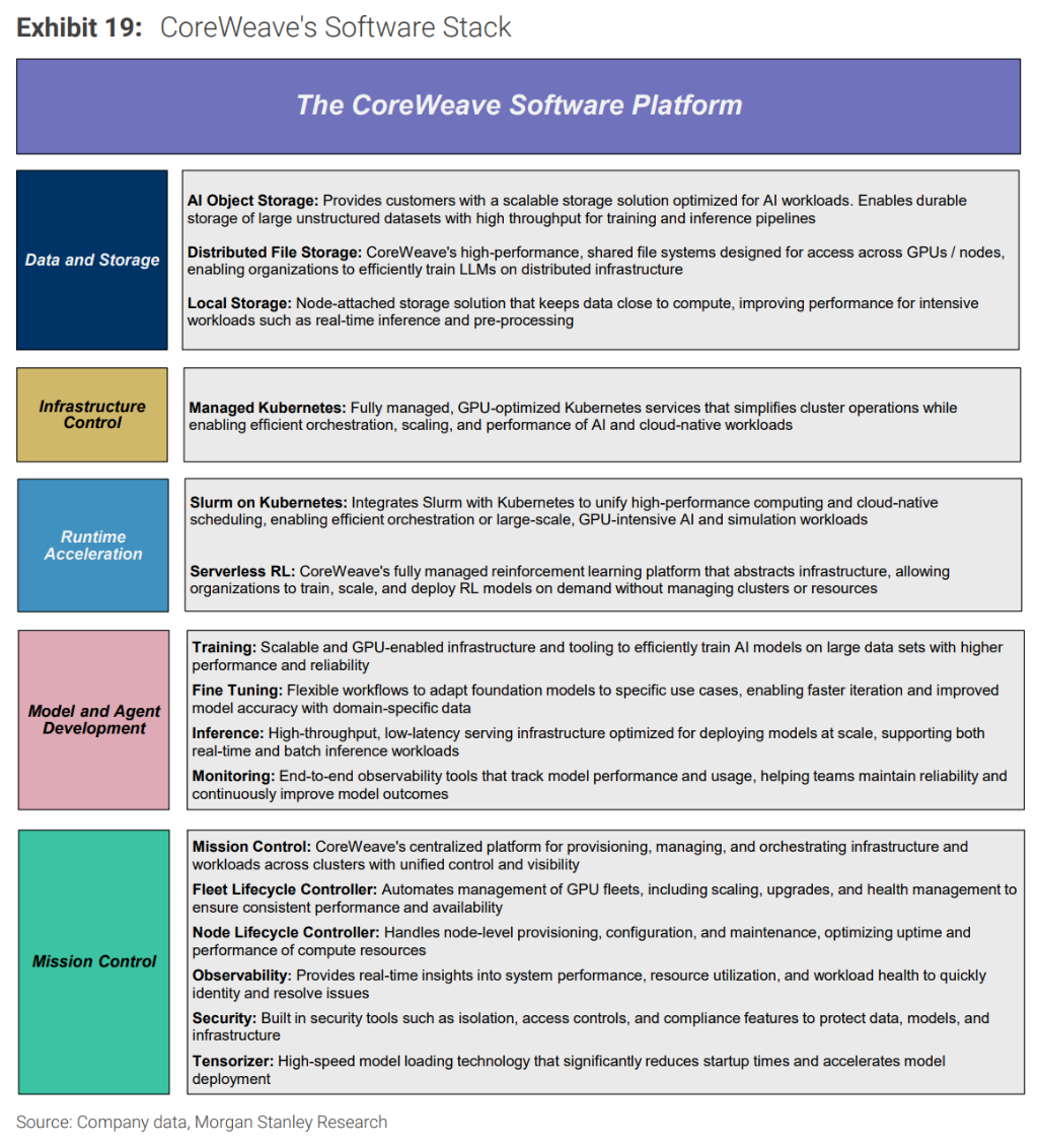CoreWeave的软件栈更为成熟,尤其在基础设施编排、可观测性、工作负载管理和存储方面,其Object Storage业务ARR已超过1亿美元(截至2025年三季度),并通过NVIDIA合作将软件直接推向全球云服务商和企业客户。