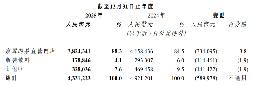 奈雪的茶加大门店收缩的背后,是其对低效门店的优化调整。年报明确提到,集团深化门店评估机制,定期对所有门店进行动态评估,对表现不及预期的门店及时关停,优化资源配置。但门店数量的大幅减少,直接拖累了营收规模——2025年直营门店总营收38.24亿元,较2024年的41.58亿元同比下滑8.0%。