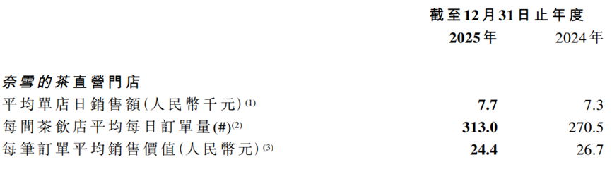但值得警惕的是,单店日销售额的增长幅度(5.5%)远低于订单量的增长幅度(15.7%),核心症结在于客单价的持续下滑。2025年,奈雪每笔订单平均销售价值为24.4元,较2024年的26.7元同比下滑8.6%。