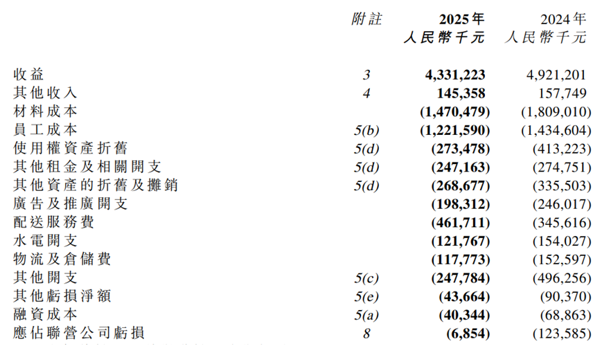集团的关店策略确实带来成本端的显著优化。2025年,集团各项成本费用占总营收的比例均有不同程度优化:材料成本同比下降18.7%至14.71亿元,占总营收的34.0%,较2024年的36.8%下降2.8个百分点;员工成本同比下降14.8%至12.22亿元,占比从29.2%降至28.2%;使用权资产折旧同比骤降33.7%至2.74亿元。