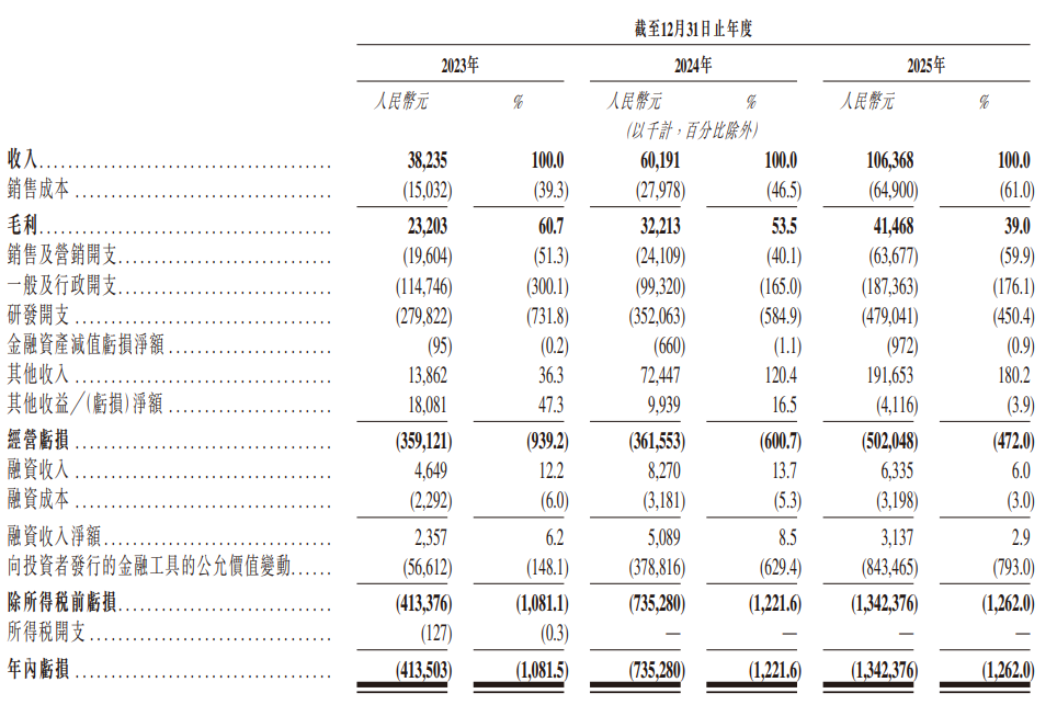 伴随收入扩张,公司盈利基础持续改善。2023年至2025年,毛利由2320万元提升至4147万元,规模稳步扩大。与此同时,研发开支占当年总收入的比例也从731.8%下降至450.4%,研发效率明显提升。整体来看,公司正逐步从单纯投入期迈向投入与产出并行的商业化阶段。