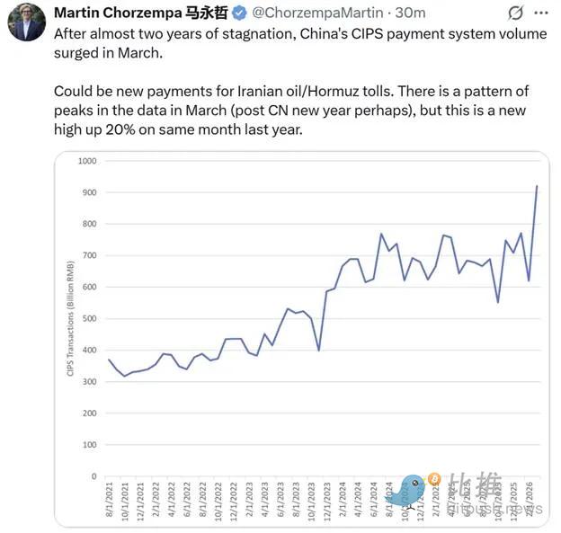 由于十五年前美国实施的制裁,伊朗无法使用 SWIFT 支付报文网络。要将人民币送入伊朗革命卫队的脏手,需要使用中国的法币 CIPS 报文系统。如你所见,战争开始后成交量显著增加。