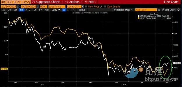 比特币(金色)对比美国软件 SaaS ETF IGV US(白色)