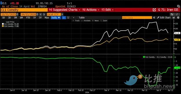 要回答海峡是开放还是关闭,请看上面的图表。上图显示了 2026 年 5 月(CL1,白色)与 10 月(CL6,金色)的 WTI 原油期货价格。我使用 WTI 是因为这个基准与美国汽油消费者的关联度最高。只有当油价在 11 月中期选举前保持高位时,特朗普才会实质性降温。下图是两份合约的价差;曲线处于逆向市场(backwardation)。因为远月油价涨幅不及近月,市场认为会有足够的石油流过海峡。如果这种情况发生,价差会扩大。但如果价差收窄是因为远月价格上涨,那么全球经济将陷入一片混乱。忽略特朗普和伊朗革命卫队之间的所有相互叫嚣,专注于这张图表。