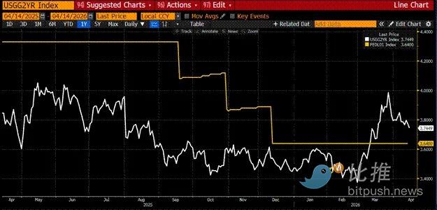 战争开始后,两年期国债收益率(白色)飙升幅度远超有效联邦基金利率(金色)。这表明市场认为美联储将加息以应对不断上升的能源通胀。