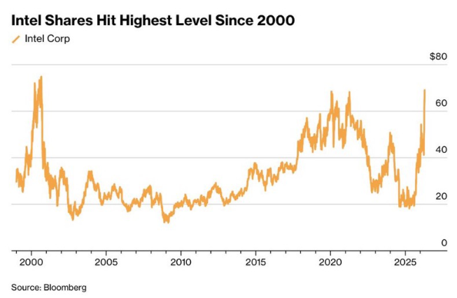 经历了漫长的沉寂之后,英特尔股价在2026年上演了一场令人瞠目的翻身仗。截至上周五收盘,该股年内累计涨幅已高达约86%,股价一度触及70.32美元,这是自互联网泡沫破灭以来的最高盘中价位,距离2000年8月的历史巅峰仅一步之遥。