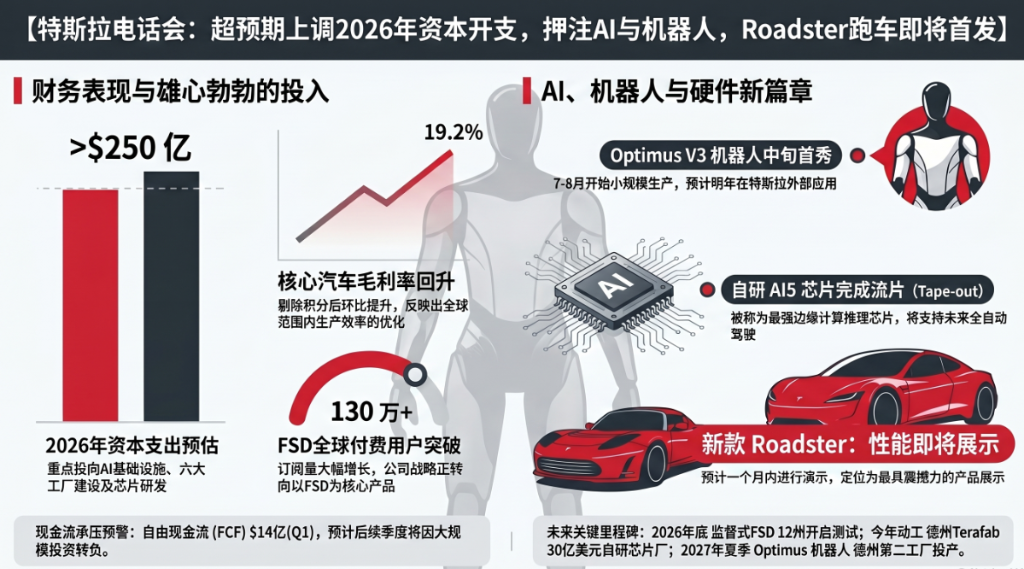 特斯拉2026年Q1财报电话会透露了公司战略的重大转向。特斯拉明确表示“FSD是核心产品,汽车仅为交付载体”,并确认HW3算力已无法支持无监督FSD。为支撑AI芯片、Robotaxi及Optimus机器人的发展,特斯拉预计2026年资本支出超250亿美元。马斯克重申,特斯拉正全力押注AI与自动化未来。