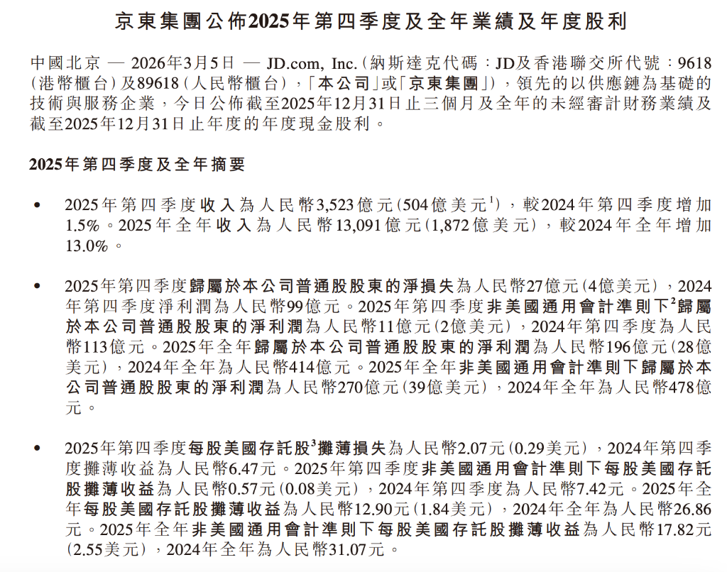 京東:四季度收入3523億元淨虧損27億元,2025年調整後淨利潤270億元