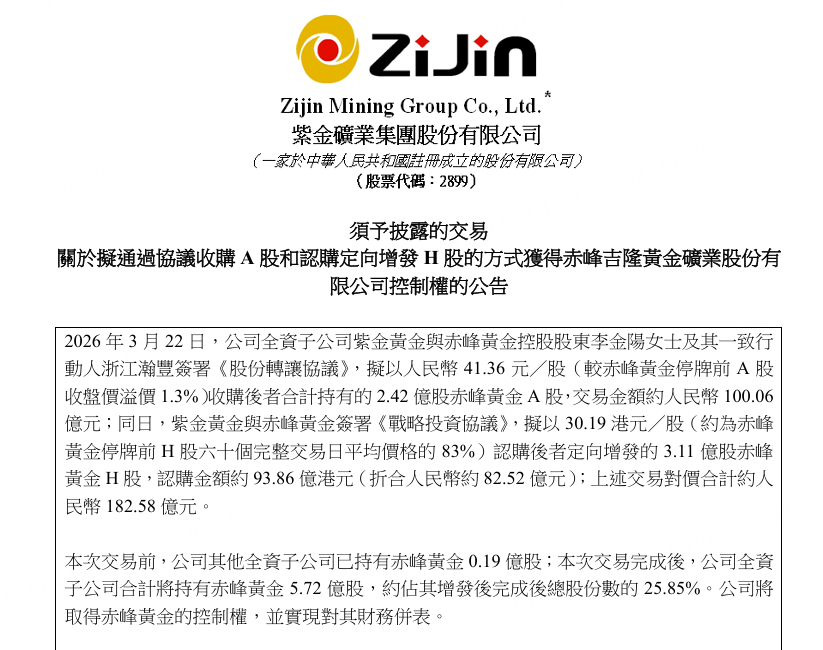 3月23日,紫金礦業公告,3月22日,公司全資子公司紫金黃金與赤峰黃金控股股東李金陽女士及其一致行動人浙江瀚豐簽署《股份轉讓協議》,擬以人民幣41.36元/股(較赤峰黃金停牌前A股收盤價溢價1.3%)收購後者合計持有的2.42億股赤峰黃金A股,交易金額約人民幣100.06億元;