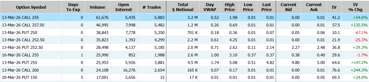 蘋果上周五收跌2.21%,期權合約成交80.06萬張,3月13日到期的255美元的行權看漲期權交易量特別高,共有5,435份合約交易。