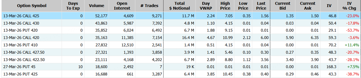 美光科技期權合約成交76.02萬張,較90日均量放大2.1倍。3月13日到期的425美元的行權看漲期權交易量特別高,共有52,177份合約交易。
