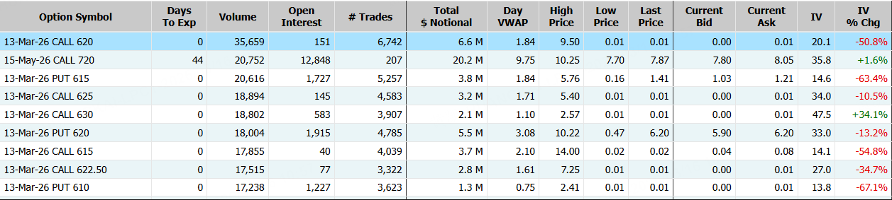 Meta Platforms上周五跌近4%,期權合約成交86.03萬張,3月13日到期的620美元的行權看漲期權交易量特別高,共有35,659份合約交易。