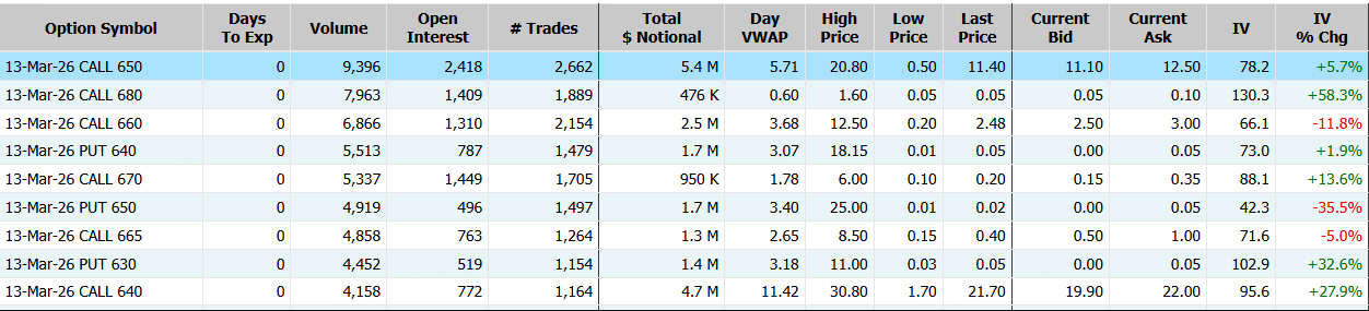 閃迪期權合約成交22.57萬張,較90日均量放大2.2倍。3月13日到期的650美元的行權看漲期權交易量特別高,共有9,396份合約交易。