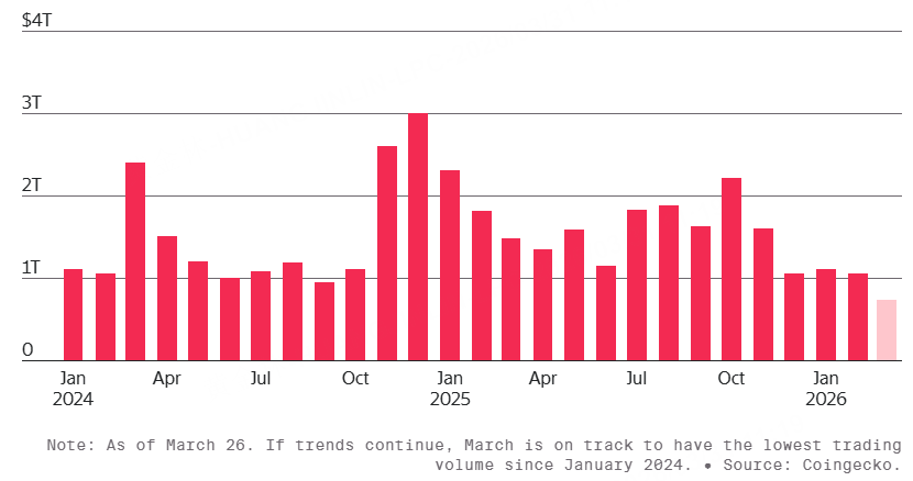 CoinGecko數據顯示,月度交易量料將創下2024年1月以來新低,不足大選後高峯的三分之一。加密初創公司孖展額一季度降至約29億美元,按月銳減69%。