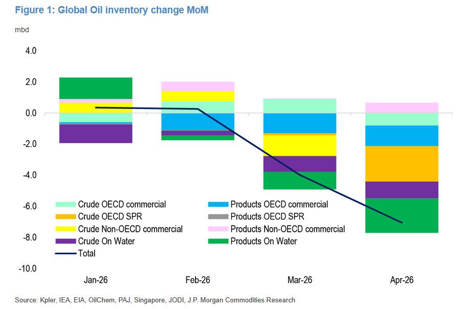 閒置產能頂不上之後,庫存被迫上場。摩根大通估算,3月可觀測庫存日均抽取4.0mbd,4月加速到7.1mbd——用庫存硬扛缺口的力度在顯著上升。