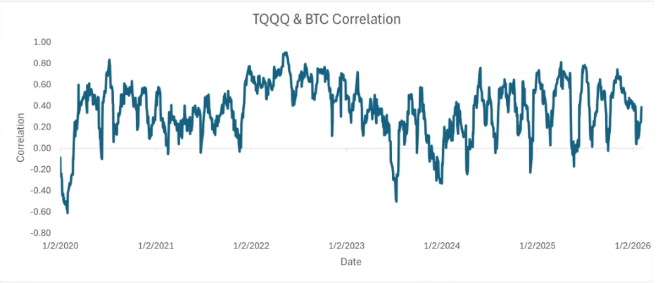 數據顯示,比特幣與納斯達克100三倍槓桿ETF(TQQQ)的21日滾動相關性明顯高於其與黃金的相關性。今年相關性一度高達0.78,近期仍維持在約0.4。