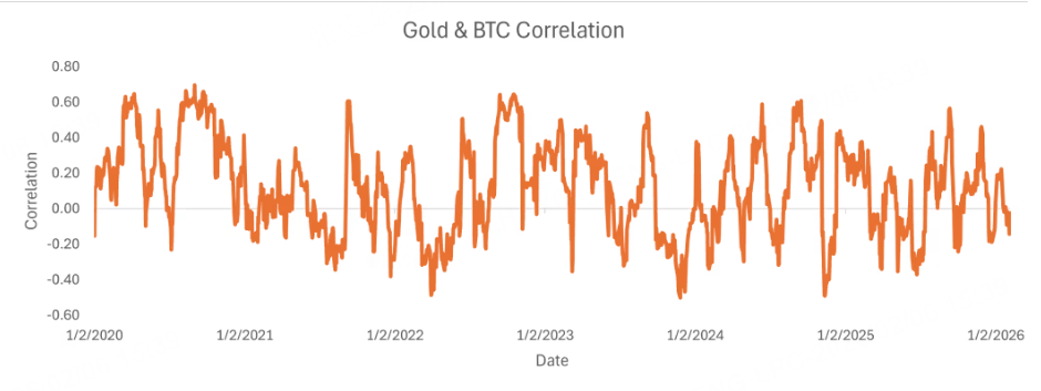 相比之下,比特幣與黃金的滾動相關性僅為-0.03,幾乎不存在聯動關係。