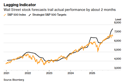 發佈標普500指數點位預測,是華爾街延續多年的傳統。每年年末,從大型投行到小衆投資機構,各路分析師都會紛紛亮出自己的預測數值。然而,這些預測向來以「屢測屢錯」聞名。Piper Sandler & Co. 的數據顯示,標普500指數的目標點位往往滯後於指數實際表現約兩個月,個股目標價的預測也存在同樣的滯後問題。