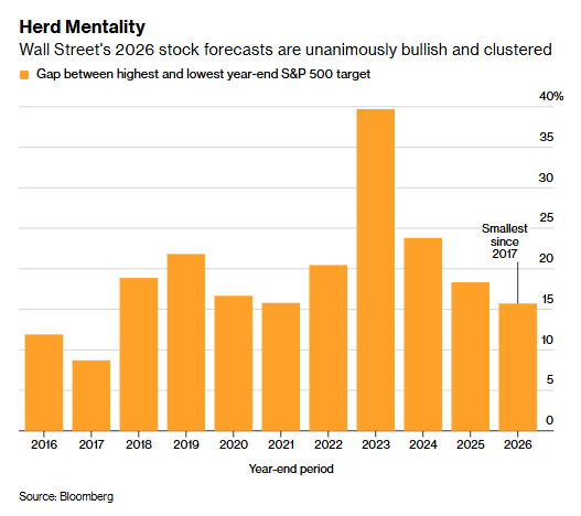 盈透證券首席策略師Steve Sosnick表示:「預測如此高度一致和集中讓我感到擔憂。如果所有人都預期相同,那麼這種預期必然已體現在當前股價中——尤其是當共識背後的邏輯大多建立在降息、減稅和AI持續主導等相似邏輯之上時。」