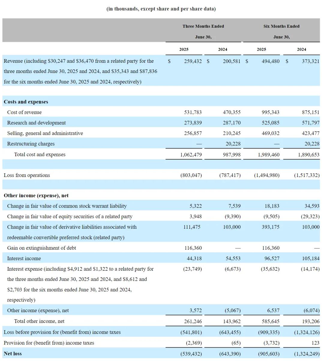 Lucid在2025年第二季度運營虧損為8億美元,上年同期的運營虧損為7.87億美元;淨虧損為5.39億美元,上年同期的淨虧損為6.43億美元。