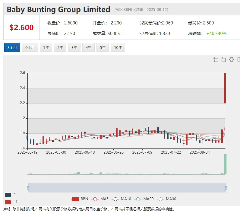 澳大利亞領先的嬰幼兒用品零售商 Baby Bunting Group Limited(ASX: BBN)公佈截至 2025 年6月29日的財年(FY25)業績。受業績增長影響,周五早盤該股股價跳空放量上漲,截止中午時分,股價最高上行至2.465澳元,對應漲幅逾三成。