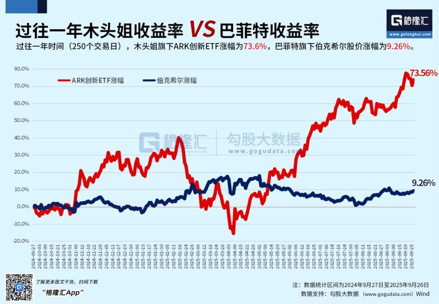 過往一年時間(250個交易日),木頭姐旗下ARK創新ETF漲幅為73.6%,巴菲特旗下伯克希爾股價漲幅為9.26%。