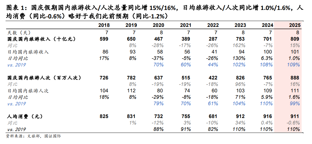 金吾財訊 | 國證國際研報指出,據文旅部數據(圖表1),2025年國慶假期(8天)國內旅遊收入8,090億元,旅遊人次8.9億,旅遊收入/人次總量同比增15%/16%,旅遊收入/人次日均同比增1.0%/1.6%,人均旅遊花費911元/人次,略好於該機構此前預期(905元/人次),同比降-0.6%,對比該機構此前預期-1.2%,降幅較1季度(-6%)、2季度(-3%)持續收窄。據民航局數據,假期國內日均旅客量240萬人次,同比增3.4%;據航班管家數據,假期國內經濟艙均價849元,同比微增0.3%。