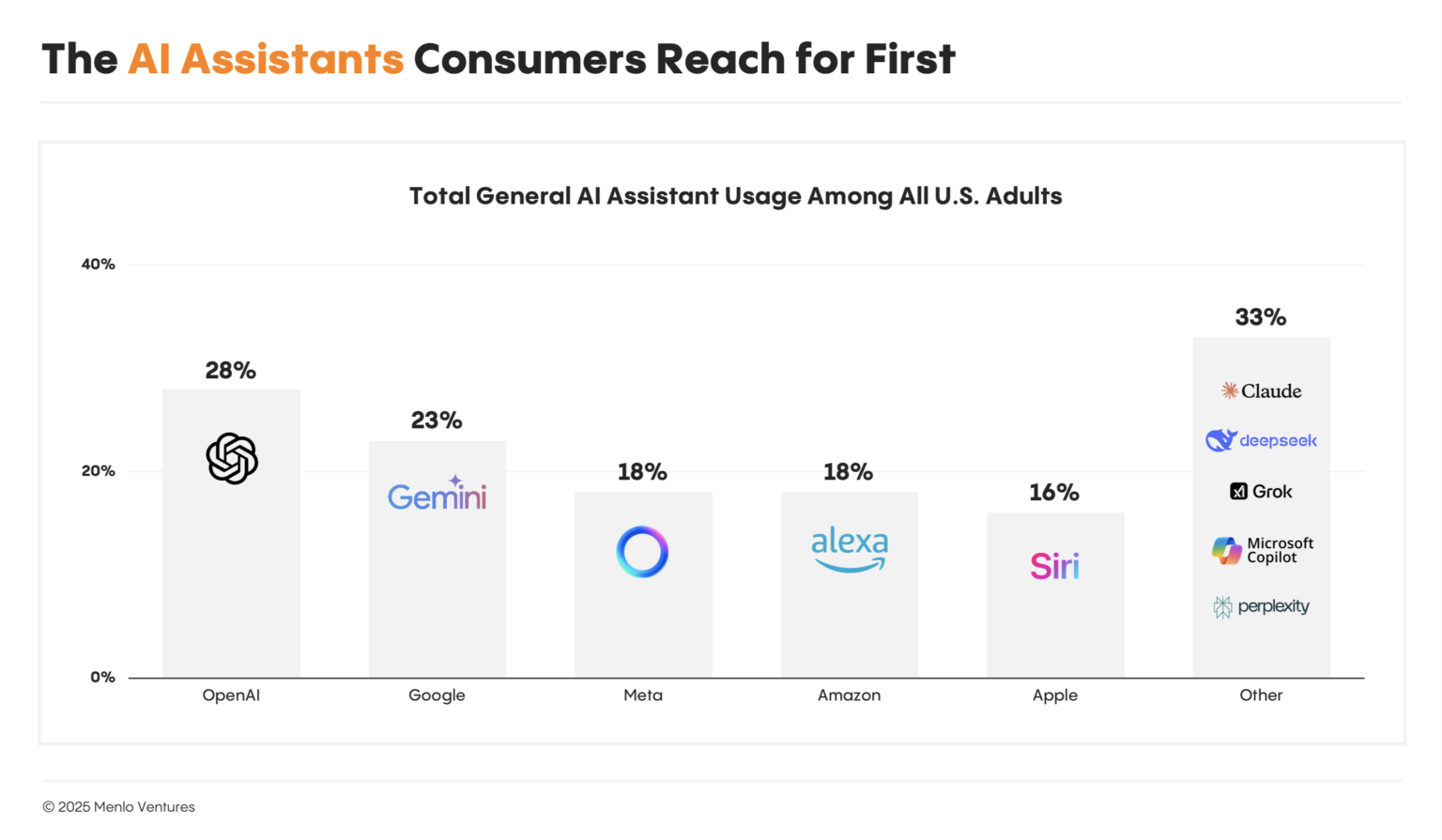 根據調研機構Menlo的數據顯示,美國有四分之一的用戶會選擇ChatGPT作為首要入口。目前整個市場競爭非常激烈,OpenAI雖然處於領先地位,但優勢並不算大。關於競爭入口的重要性,Menlo在報告中提到,「消費者幾乎總是會首先嚐試他們的默認工具。」