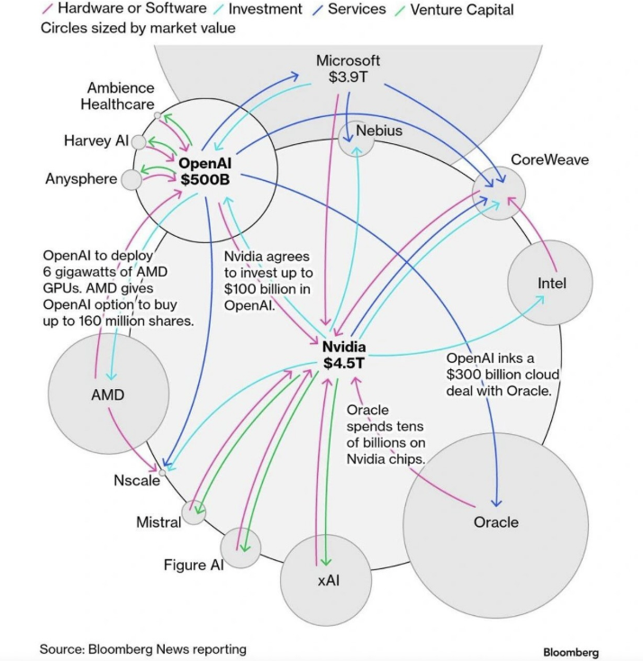 在接連發生的AI投資事件中,有人注意到OpenAI正在通過一系列芯片、數據中心建設、AI技術服務的訂單,形成了一整套閉環的價值鏈。參與到OpenAI合作的玩家們,正在組織起一個系統性的AI建設聯盟。