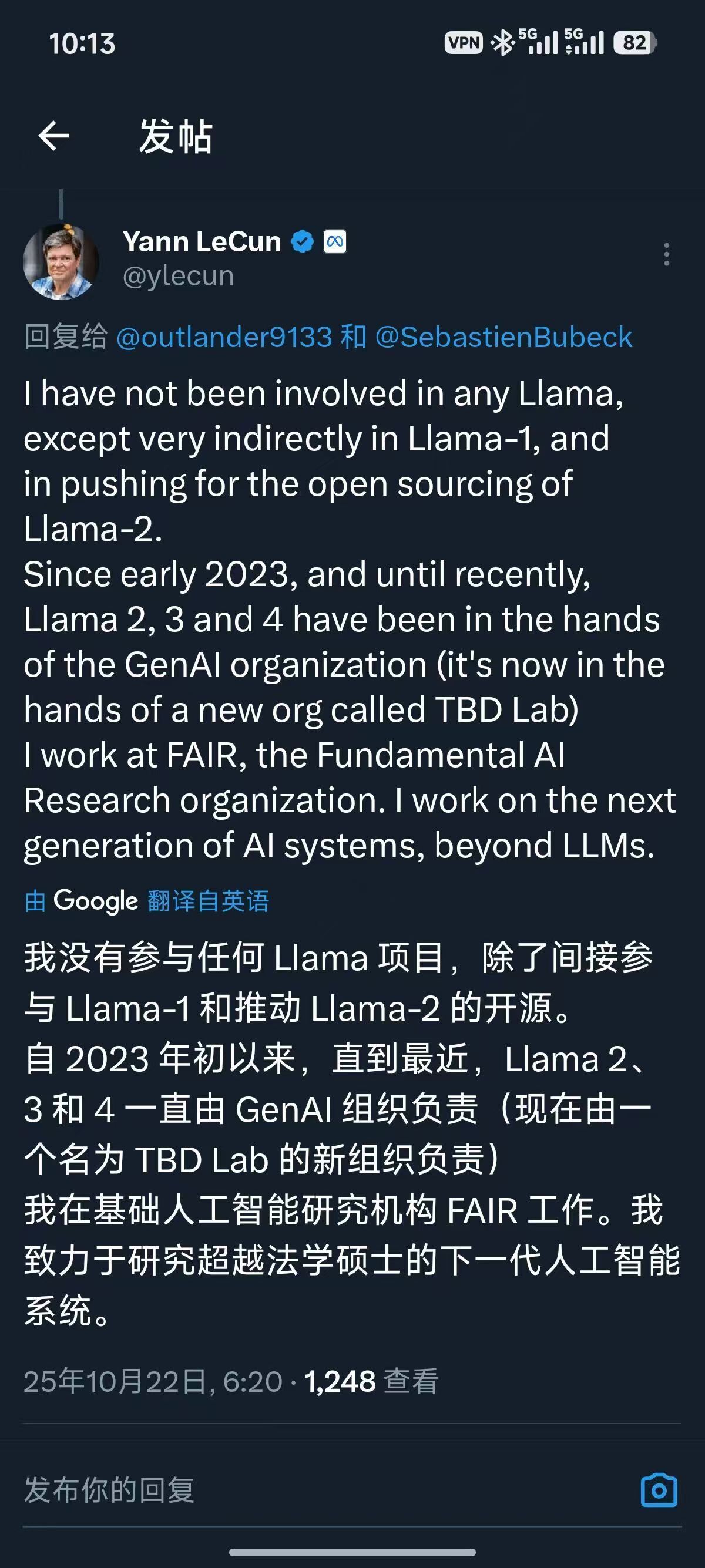 Meta首席AI科學家楊立昆(Yann LeCun)在裁員發生的同一天秀出與吳恩達合照,同時發帖與之前廣受詬病的Llama 4項目切割,他表示,除了間接參與Llama-1的開源推廣,自2023年初以來,Llama2、3和4一直由TBD實驗室負責。他本人仍在FAIR工作,致力於研究超越大語言模型的下一代AI系統。