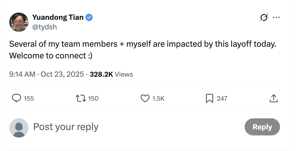 在公司內部,此次戰略性裁員也波及了資深核心員工。Meta研究員田淵棟(Yuandong Tian)在社交媒體X發帖證實:「我和我的部分團隊成員今天受到裁員影響。歡迎聯繫。」田淵棟曾任Meta FAIR團隊負責人,是MSL的重要科研支柱之一。他的離職標誌着Meta最具學術影響力的AI科學家之一正式離開公司。