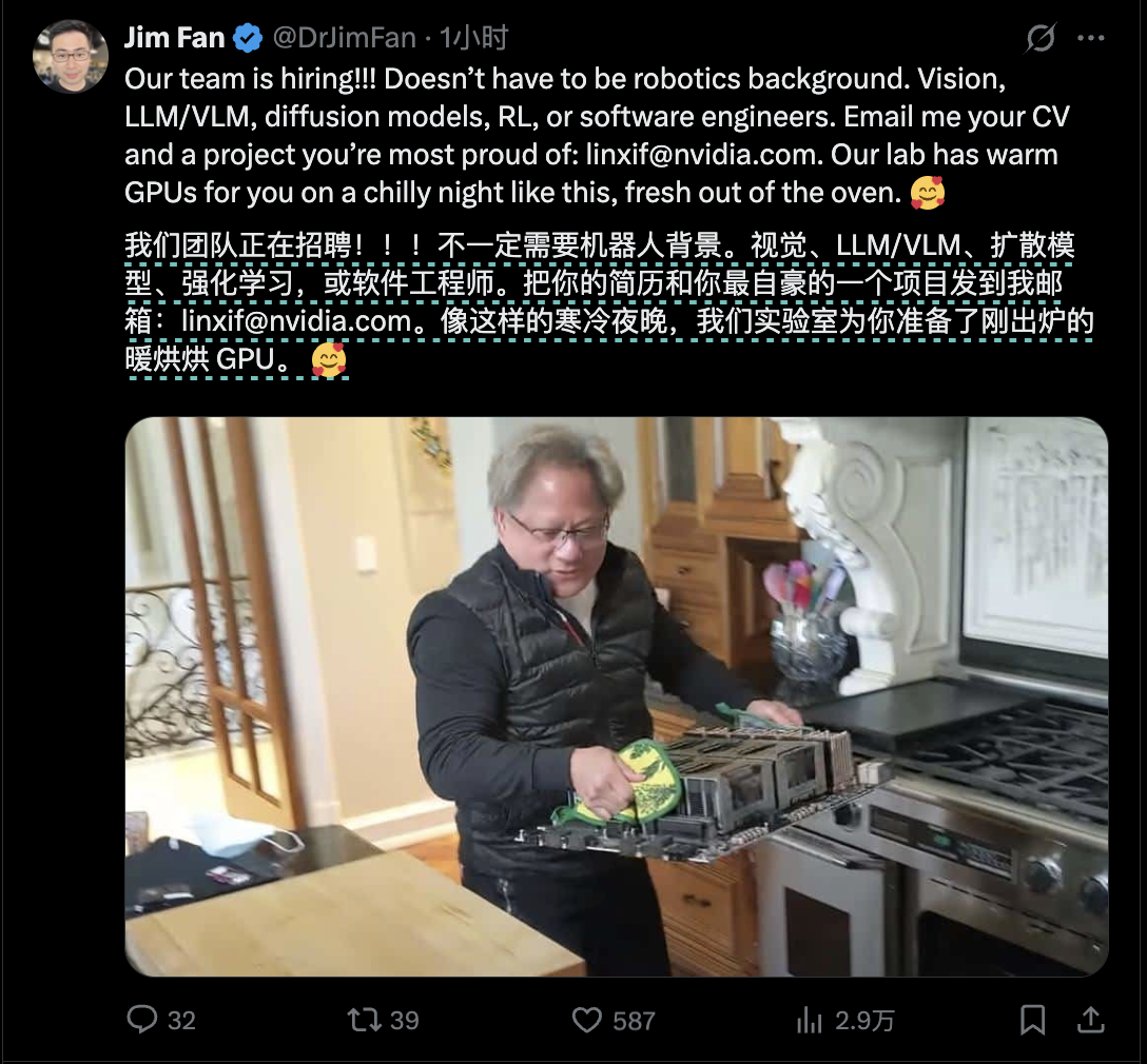 其中,英偉達高級AI研究科學家範麟熙(Jim Fan)公開發帖稱,其所在團隊正開展招聘工作,崗位覆蓋視覺領域、大語言模型/視覺語言模型(LLM/VLM)、擴散模型、強化學習(RL)及軟件工程師崗位,還特別提及「在這樣的‘寒冬’裏,我們實驗室已為大家準備好‘熱乎乎’的高性能GPU(圖形處理器)」,暗指英偉達擁有充足的算力資源,以此吸引被裁人才加入。