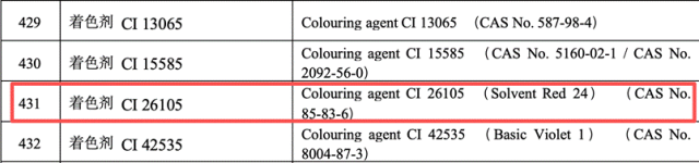 在國家藥品監督管理局2021年發佈的《化妝品禁用原料目錄》裏,蘇丹紅Ⅳ(CI 26105)位於序號431,明確為禁用成分。